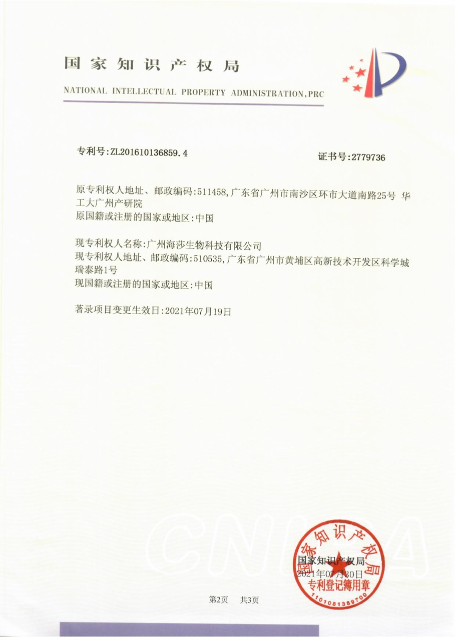 廣州海莎生物科技有限公司獲磷脂生產新專利,為開發高質量磷脂 產品提供了保障。